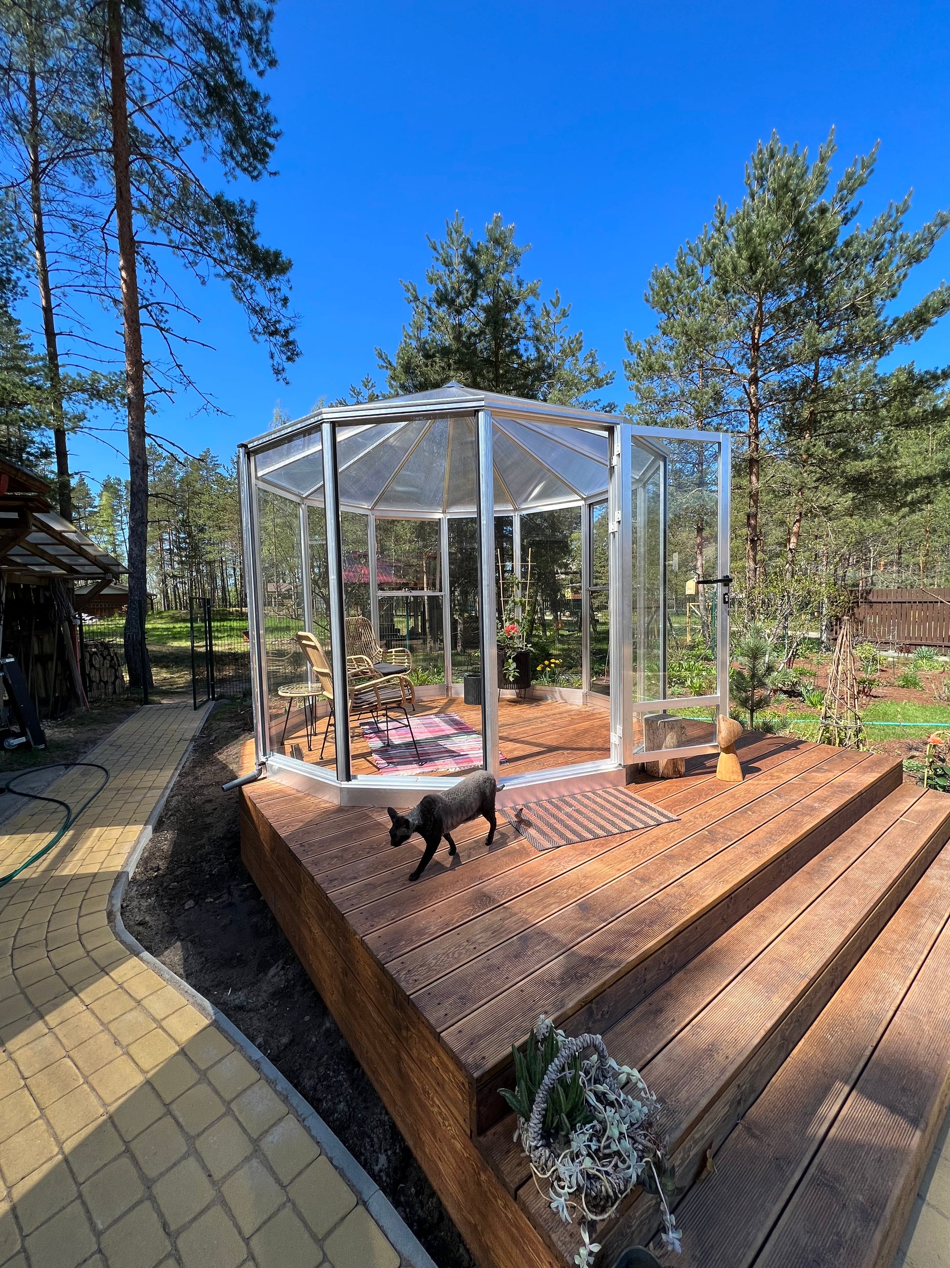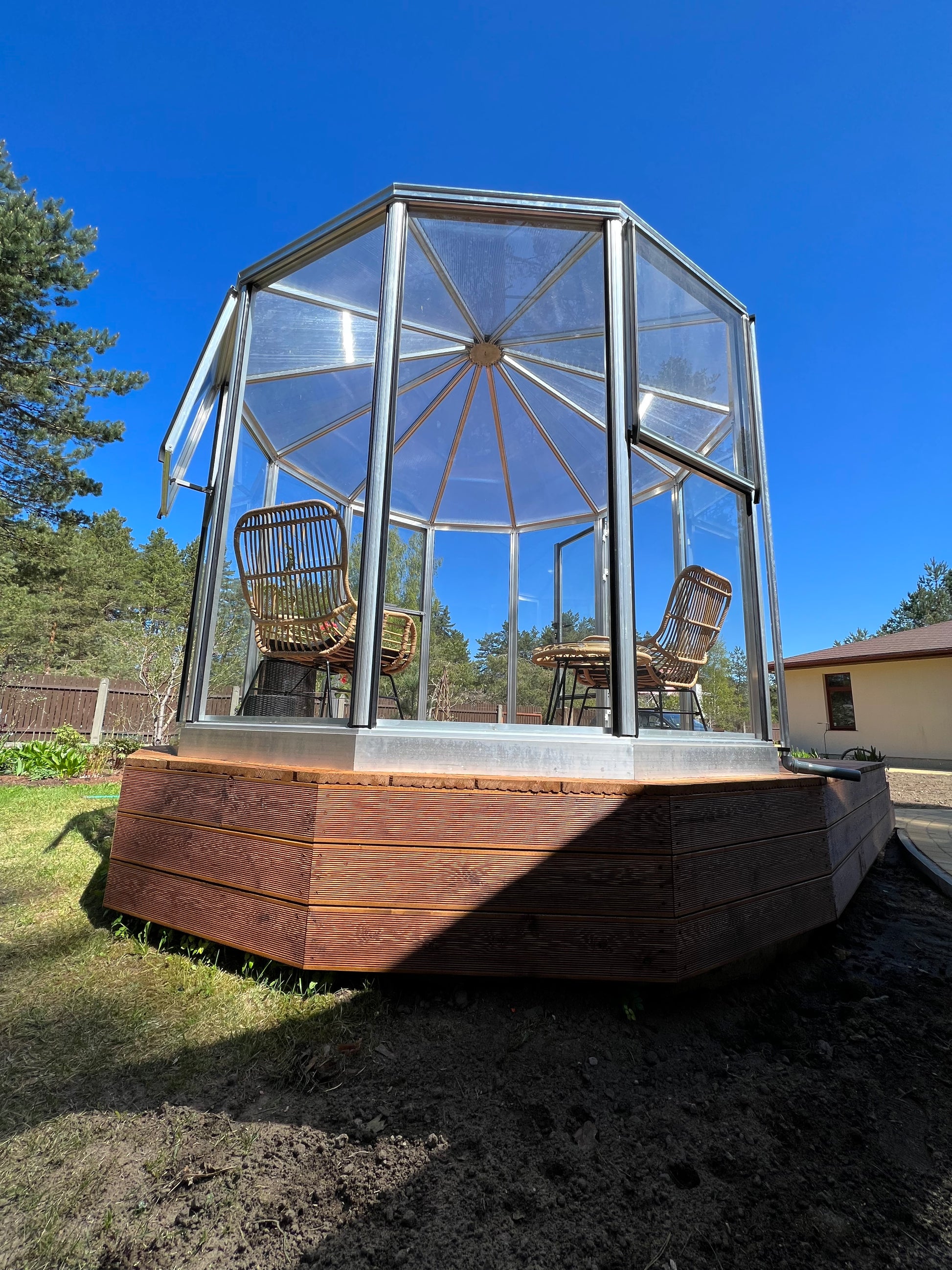 The CIRCULUS aluminium round greenhouse is a captivating octagonal orangery, masterfully designed with elegant detailing to serve as a stunning focal point in any garden. High sidewalls, hinged doors, and expansive wall windows create a bright, airy, and comfortable interior that seamlessly integrates with its surroundings.