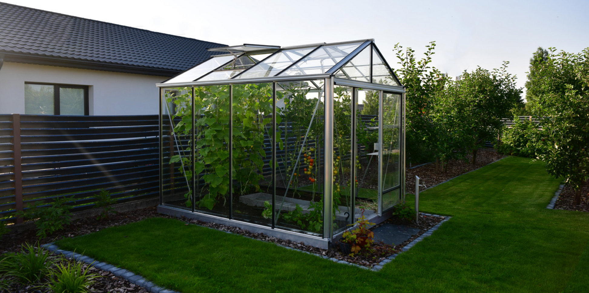 Greenhouse Design: Timeless rectangular aluminium structure with straight walls, a gable roof, roof ventilation windows, and a smooth-sliding door. Built with premium materials for durability, optimal light, and year-round plant protection.