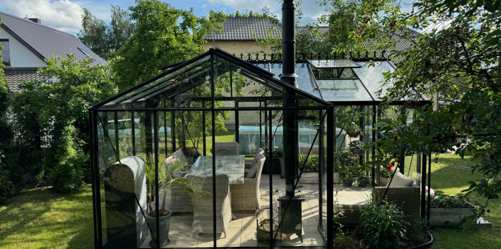 The T-FORMA aluminium greenhouse-orangery makes a bold statement in both traditional and modern garden settings, seamlessly combining timeless elegance with practical functionality.